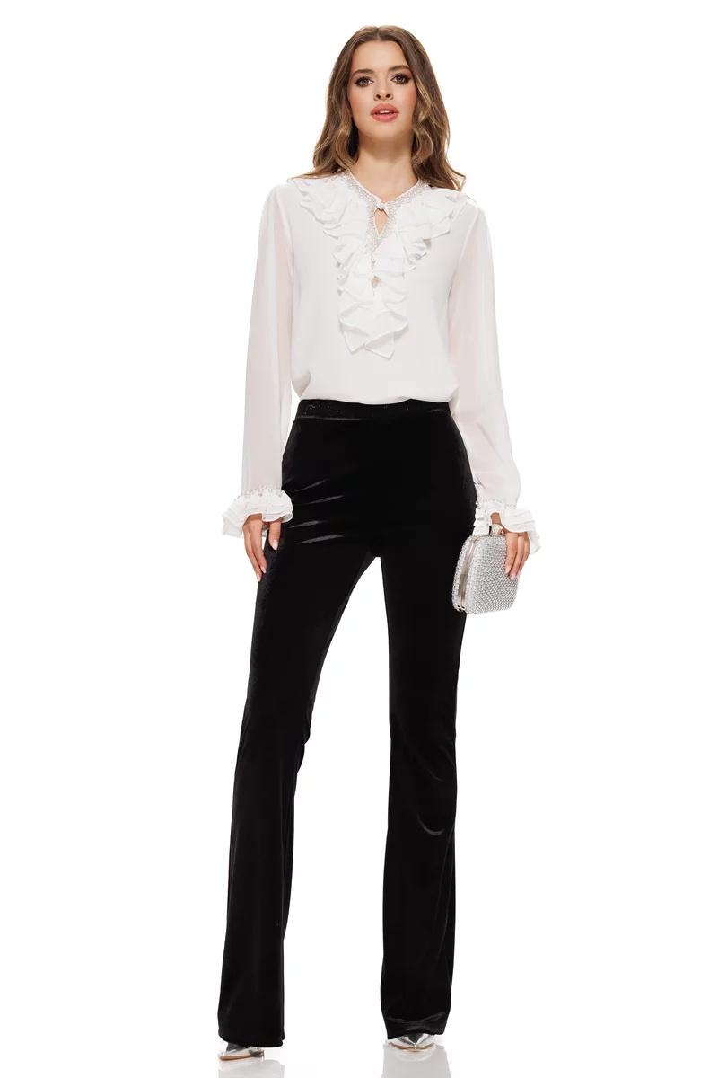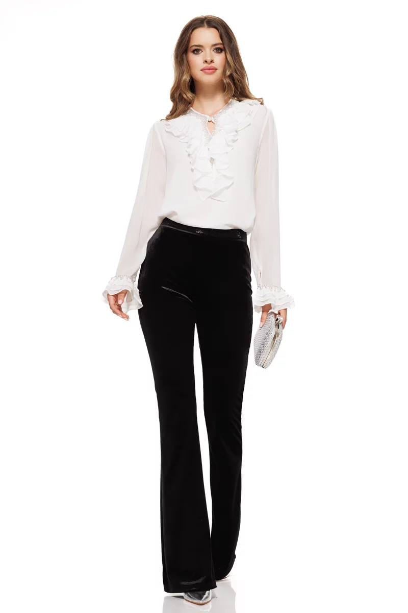 Pantaloni negri evazati din catifea elastica cu talie inalta cu strasuri