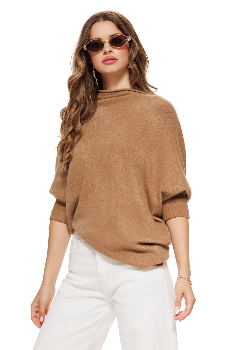 Pulover dama bej cu croi modern asimetric si maneca fluture