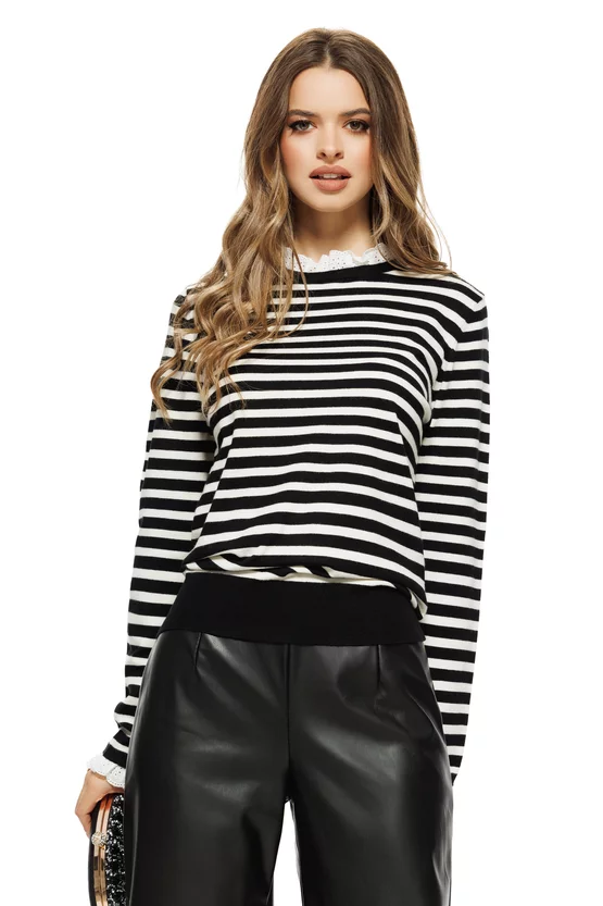 Alege acest pulover cu dungi și detalii din dantelă pentru a-ți completa garderoba cu o piesă feminină și rafinată, ideală pentru orice zi!