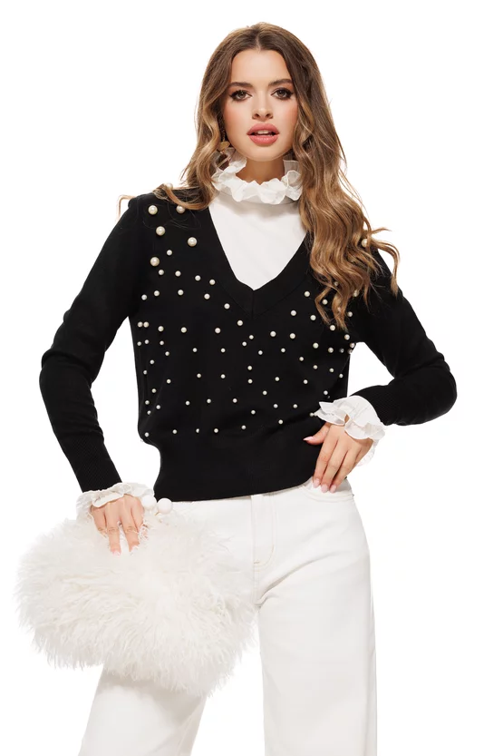 Adaugă acest pulover negru cu perle în garderoba ta și bucură-te de o piesă chic, elegantă și ușor de asortat!