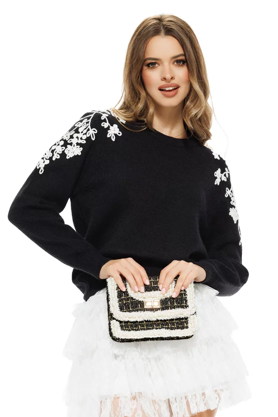 Pulover dama elegant negru cu cu broderie alba aplicata pe umeri