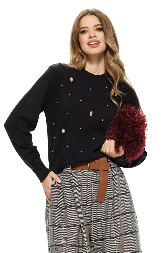 Alege acest pulover negru cu perle și pietre decorative și transformă orice ținută simplă într-una sofisticată și modernă!