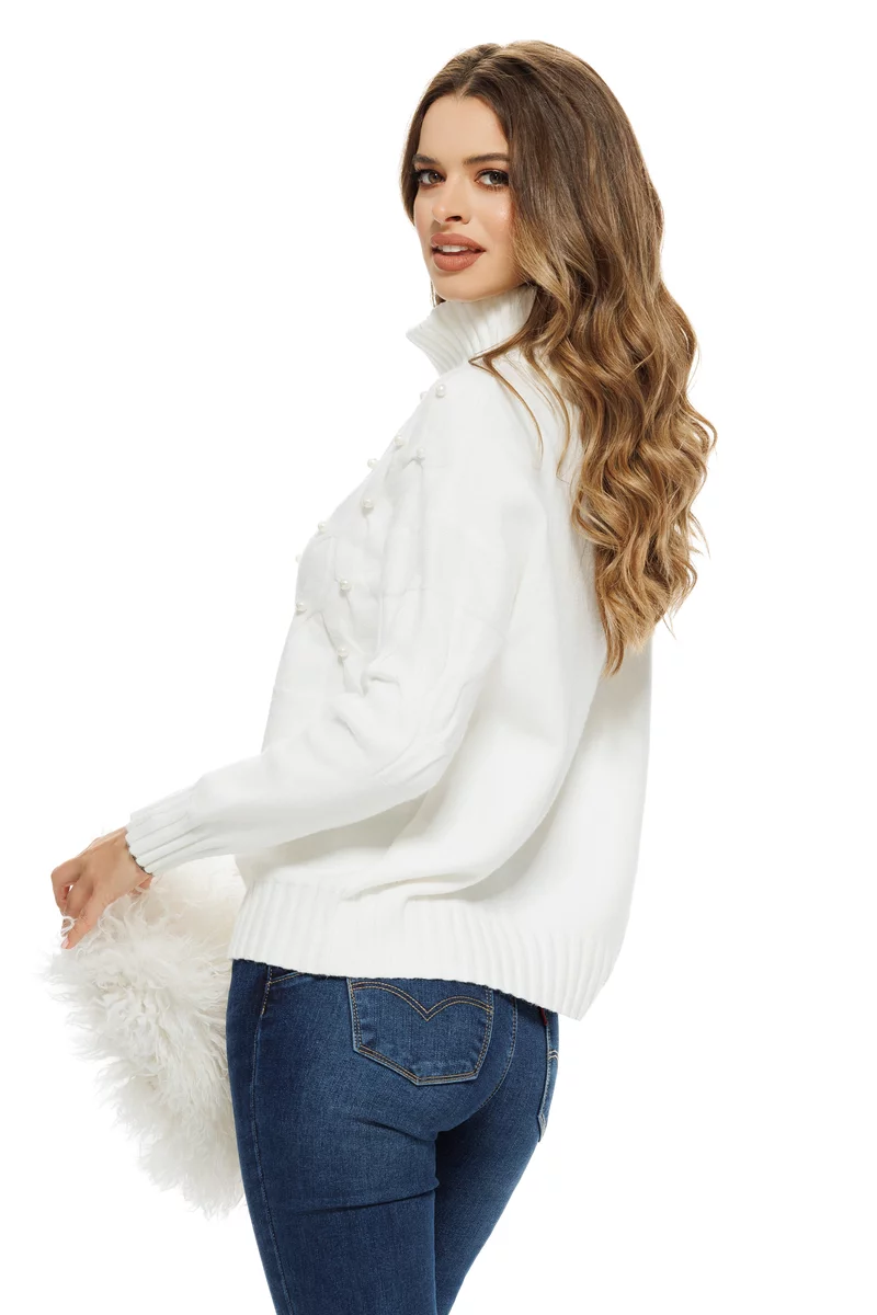 Acest pulover elegant alb este o alegere perfectă pentru femeile care iubesc detaliile delicate. Realizat dintr-un tricot moale și plăcut la atingere, modelul impresionează prin perlele aplicate manual pe partea frontală, dispuse într-un model subtil romboidal, și prin gulerul amplu rulat, care conferă o notă cochetă și protectoare în zilele reci. Croiul lejer și textura ușor elastică oferă confort și libertate de mișcare, menținând în același timp o siluetă elegantă.