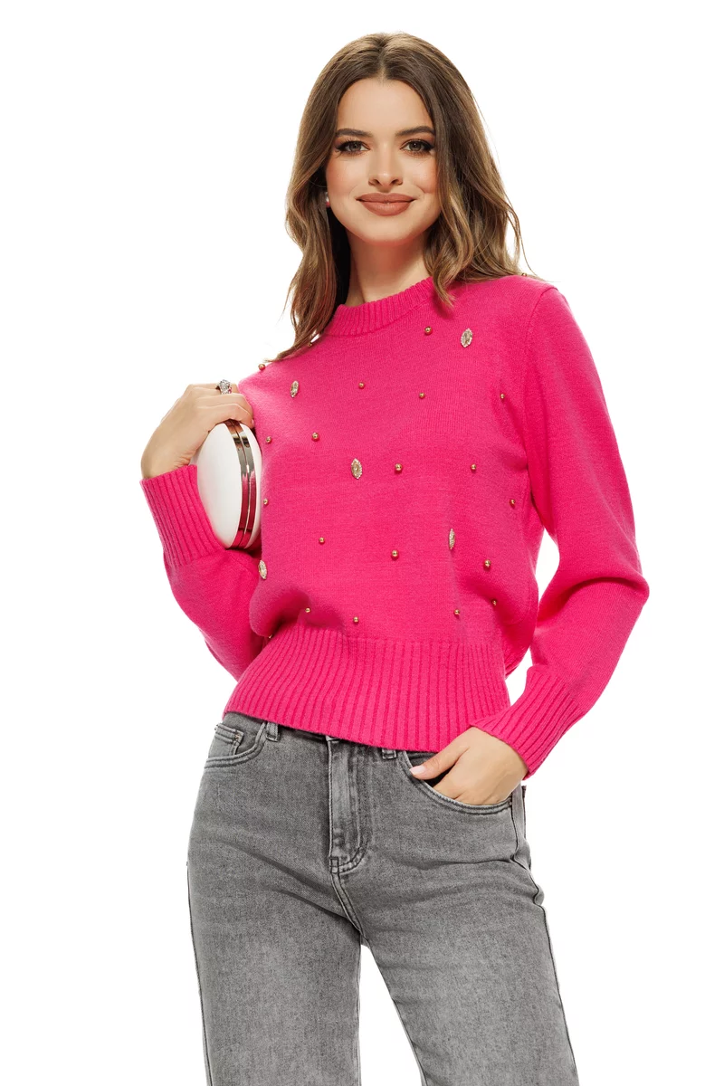 Alege acest pulover roz-ciclame cu perle și pietre decorative și transformă orice ținută simplă într-una sofisticată și modernă!