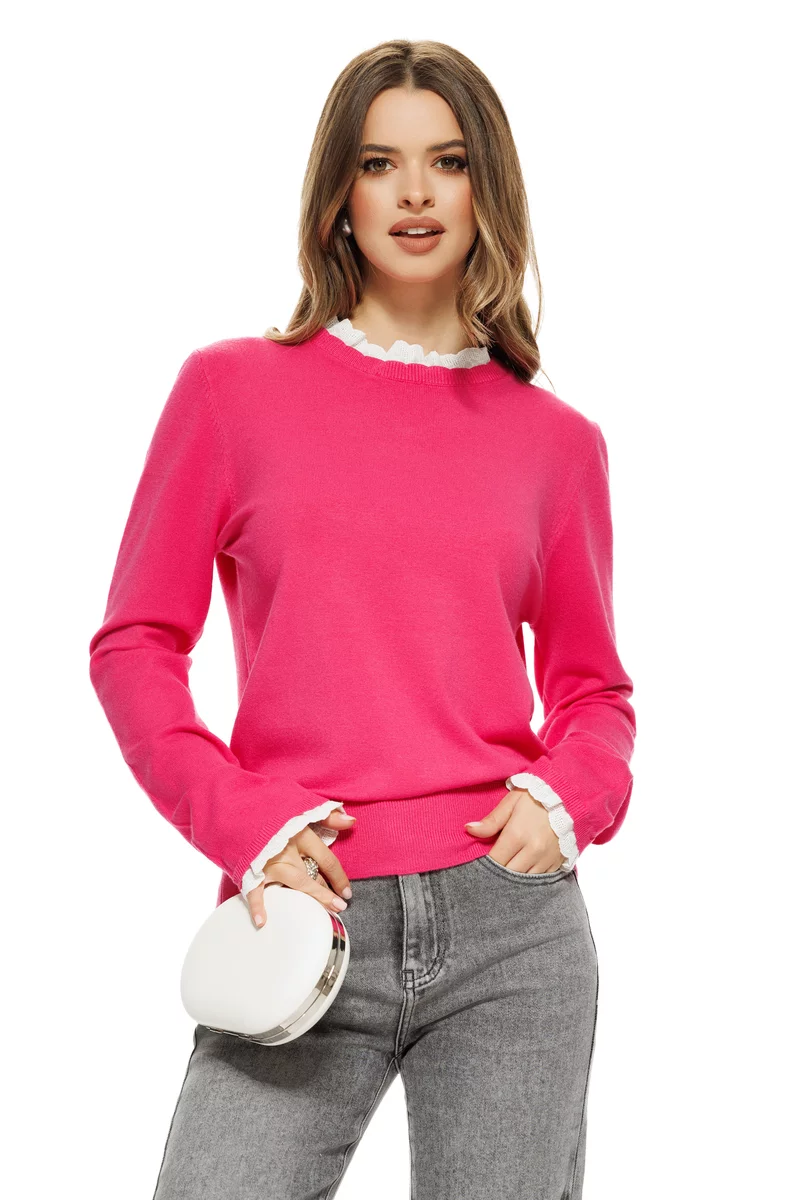 Pulover dama elegant roz ciclame premium din casmir bumbac si volanase de dantela alba