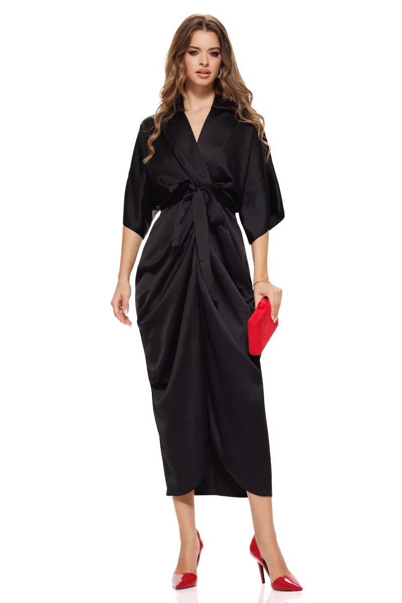 Alege această rochie din satin negru și cucerește prin rafinament și feminitate la orice eveniment!