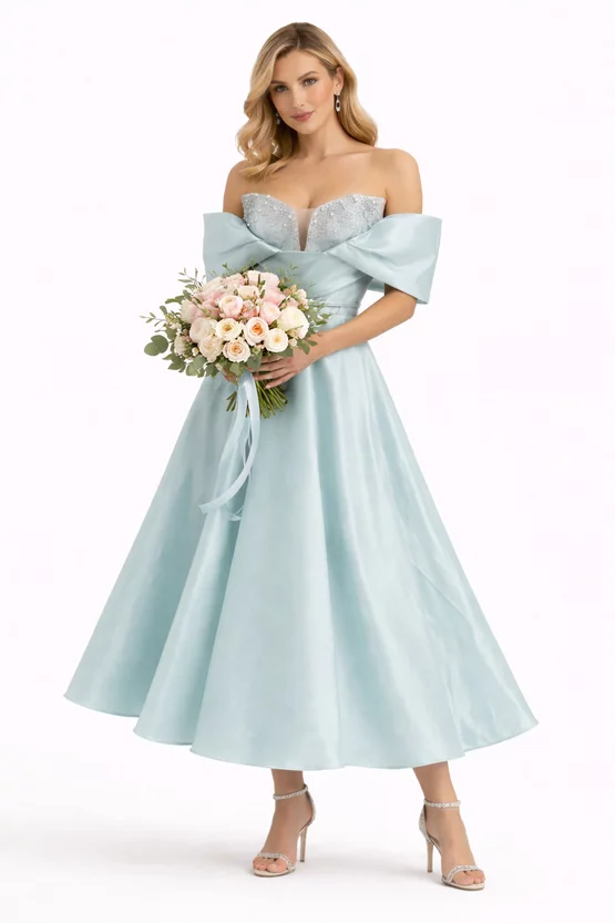 Rochie de spectaculoasa din organza turcoaz pudrat cu maneci cazute si corset cu cristale