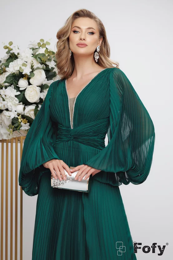 Rochie eleganta de ocazie de LUX verde din voal plisat cu bust buretat si strassuri