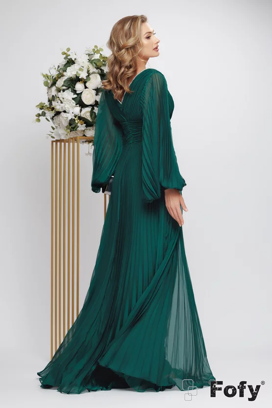 Rochie de ocazie de lux, croita din voal plisat in tonuri de verde royal. Un produs premium, apropiat de zona couture in care detaliile lucrate manual se mixeaza perfect alaturi de linia atipica, imperiala. Aceasta piesa speciala se remarca prin fusta ampla lejera, maneci bufante royale ,bustul buretat conturat cu strassuri O poti purta cu stil alaturi de piese chic in nuante uni precum cercei maxi retro sau cluch-uri stilizate cu aplicatii sofisticate. O pereche de sandale elegante cu barete subtiri in tonuri metalice, un make-up clean si un hair style stylish- vor fi elementele de care ai nevoie pentru a iesi in evidenta la un eveniment special.