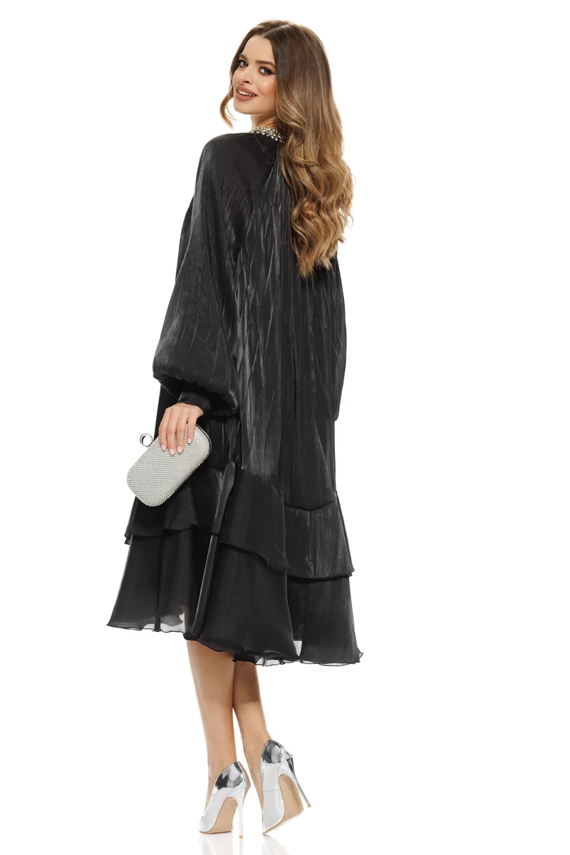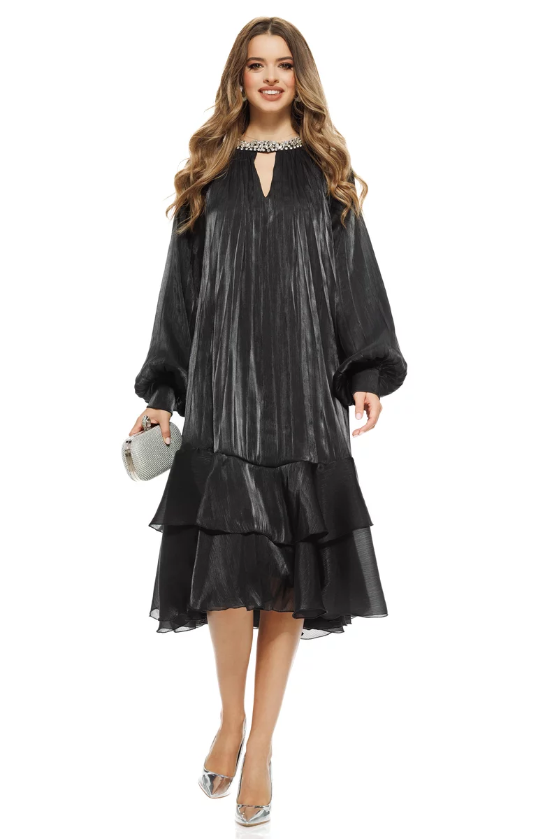Alege această rochie neagra plisată cu cristale și volane vaporoase și cucerește printr-o apariție spectaculoasă, plină de rafinament și feminitate!