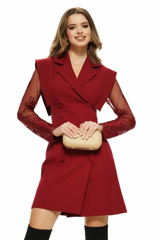 Alege această rochie bordo tip sacou cu mâneci din dantelă și transformă-ți fiecare apariție într-o declarație de stil și feminitate!