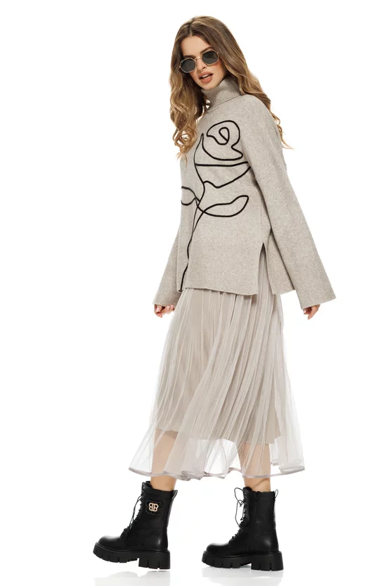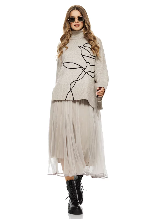 Feminin, rafinat și plin de grație – acest compleu bej din rochie plisată și pulover tricotat este alegerea ideală pentru femeile care iubesc eleganța discretă și confortul sofisticat. Setul este compus dintr-o rochie vaporoasă din tulle plisat, cu un efect delicat de mișcare, și un pulover fin din tricot moale, decorat cu o floare stilizată neagră, cusută minimalist, ce adaugă un accent artistic modern.