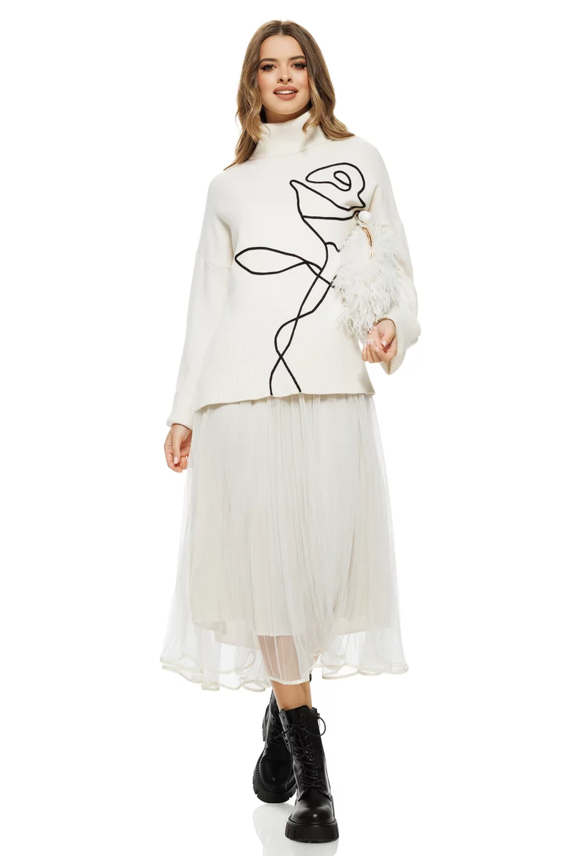 Compleu dama elegant crem cu angora pulover pe gat cu trandafir si rochie cu fusta de tull plisat bordurata