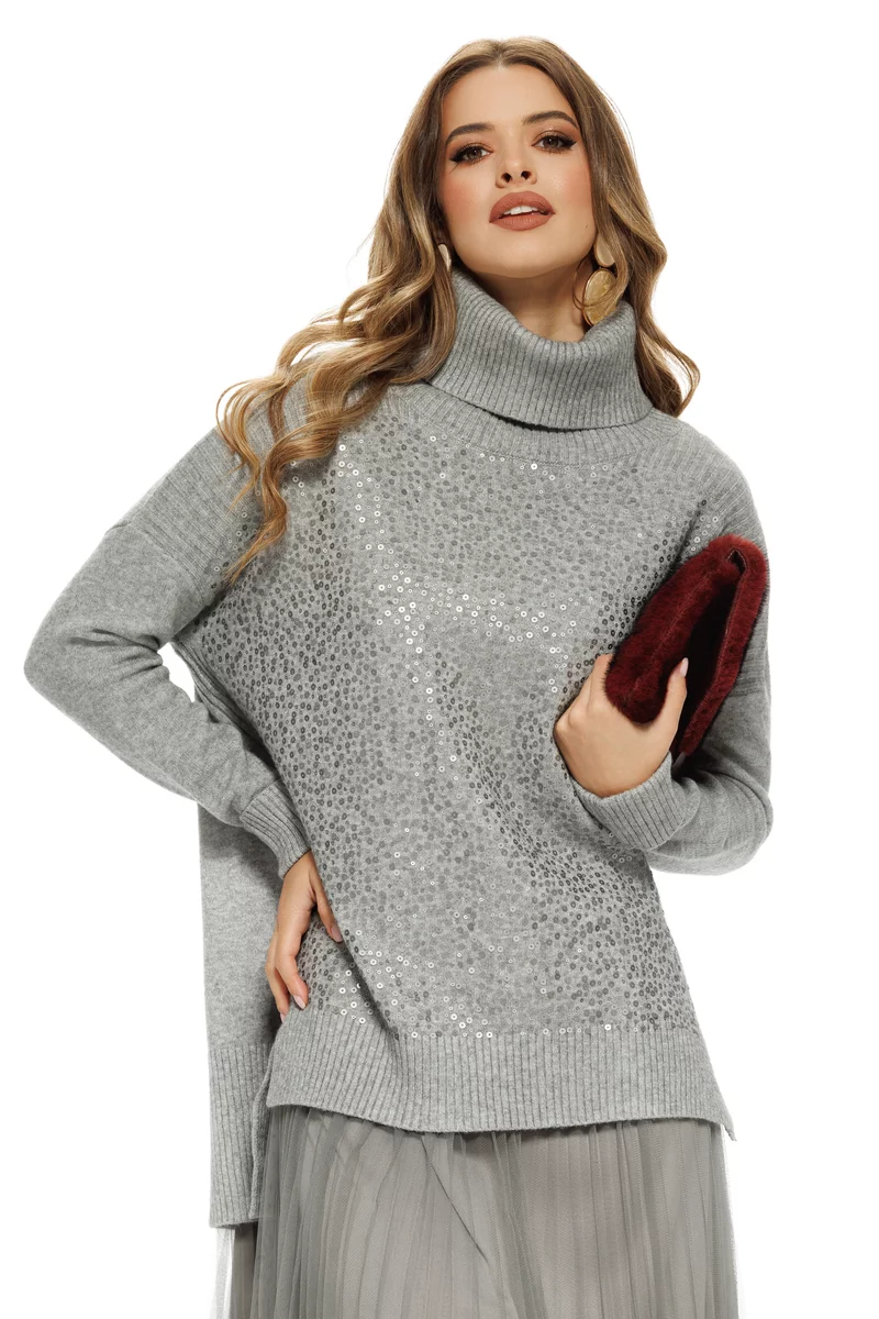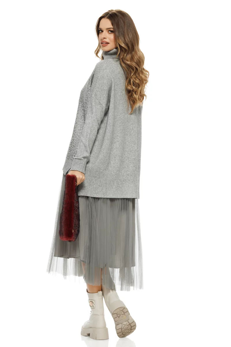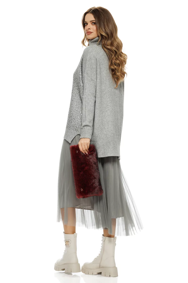 Acest compleu gri este alegerea perfectă pentru femeia care iubește eleganța subtilă și confortul rafinat. Format dintr-un pulover tricotat cu paiete fine și o rochie midi plisată din tulle vaporos, setul emană feminitate și rafinament la fiecare pas.