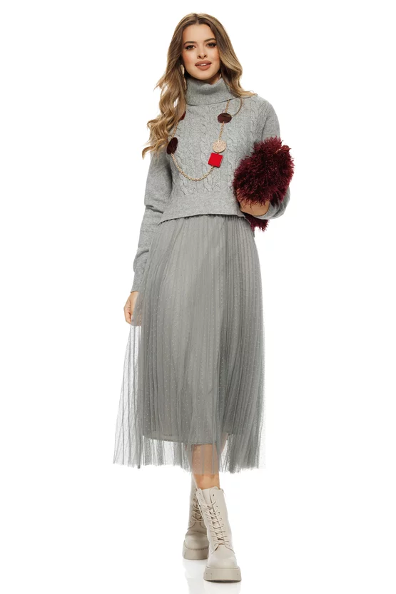 Compleu dama elegant gri cu angora pulover pe gat cu torsade si rochie cu fusta de tull plisat cu buline