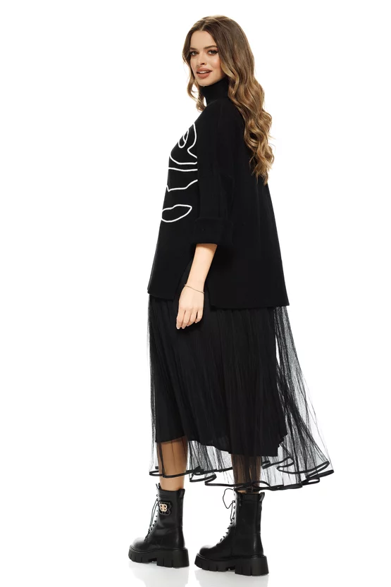 Compleu dama elegant negru cu angora pulover pe gat cu trandafir si rochie cu fusta de tull plisat bordurata