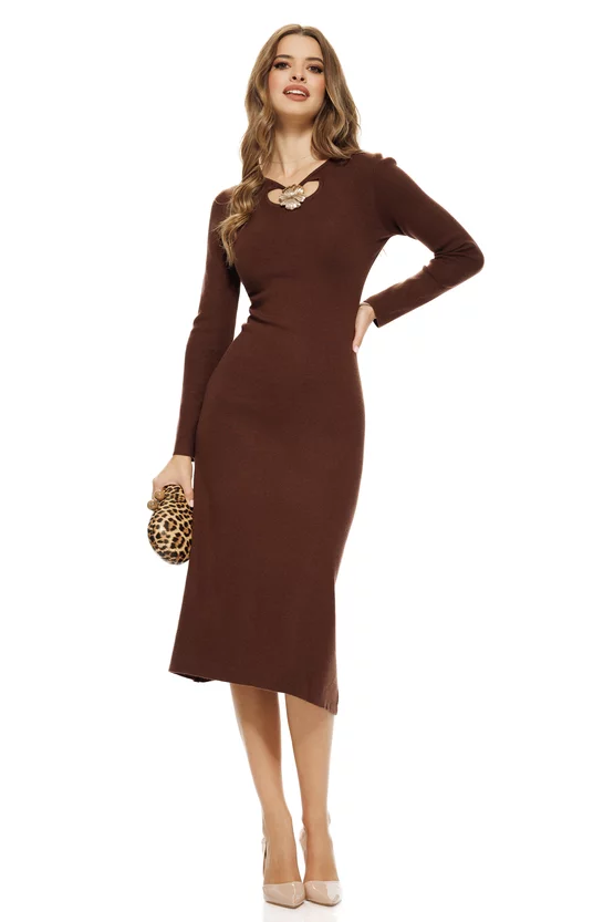 Rochia maro midi cu broșă aurie este o piesă ce emană eleganță naturală și finețe în fiecare detaliu. Confecționată dintr-un material moale și elastic, cu o textură plăcută la atingere, această rochie se așază armonios pe corp și oferă confort pe tot parcursul zilei.