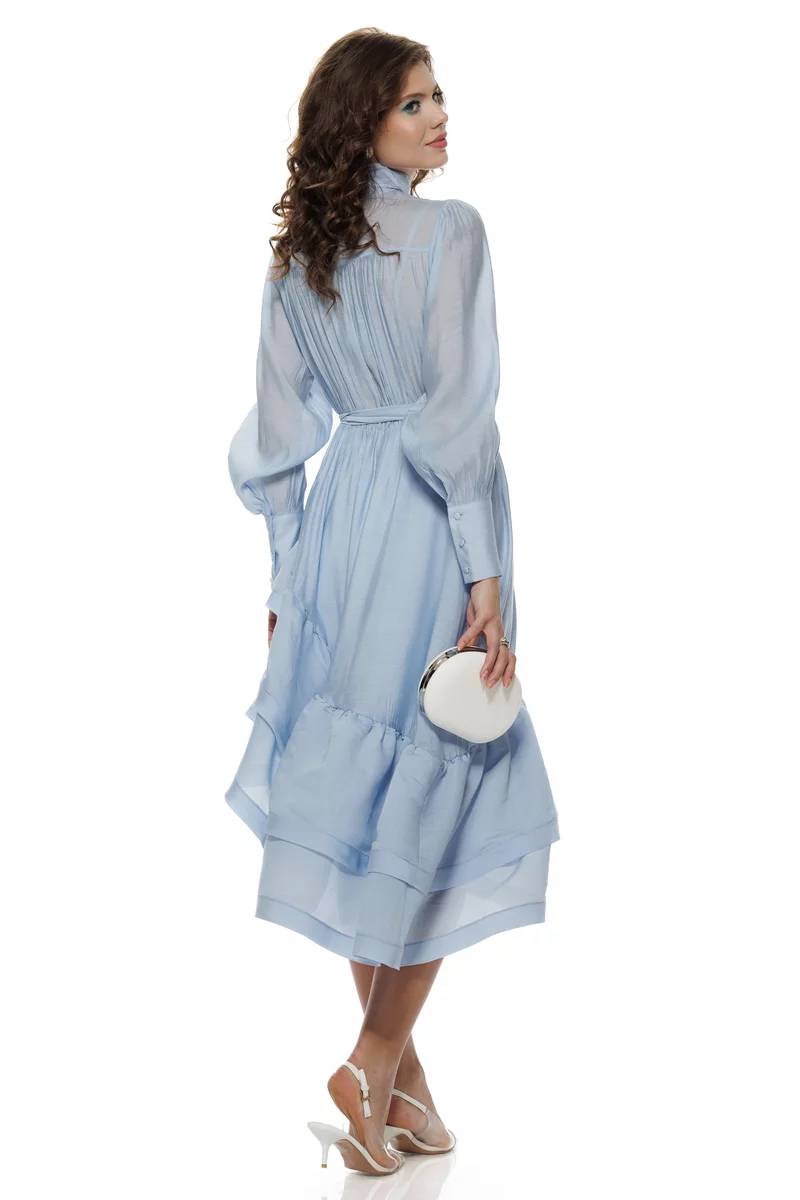 Diafană, rafinată și spectaculoasă, această rochie baby blue din organză premium creează o apariție de poveste. Partea superioară delicată evidențiază talia, iar fusta asimetrică cu volane întărite oferă volum elegant și mișcare grațioasă la fiecare pas. Este rochia care atrage privirile prin finețe și stil, perfectă pentru momentele în care vrei să te simți specială.
