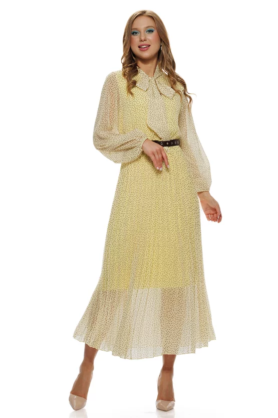 Rochie eleganta din voal matasos galben cu volane si imprimeu cu buline