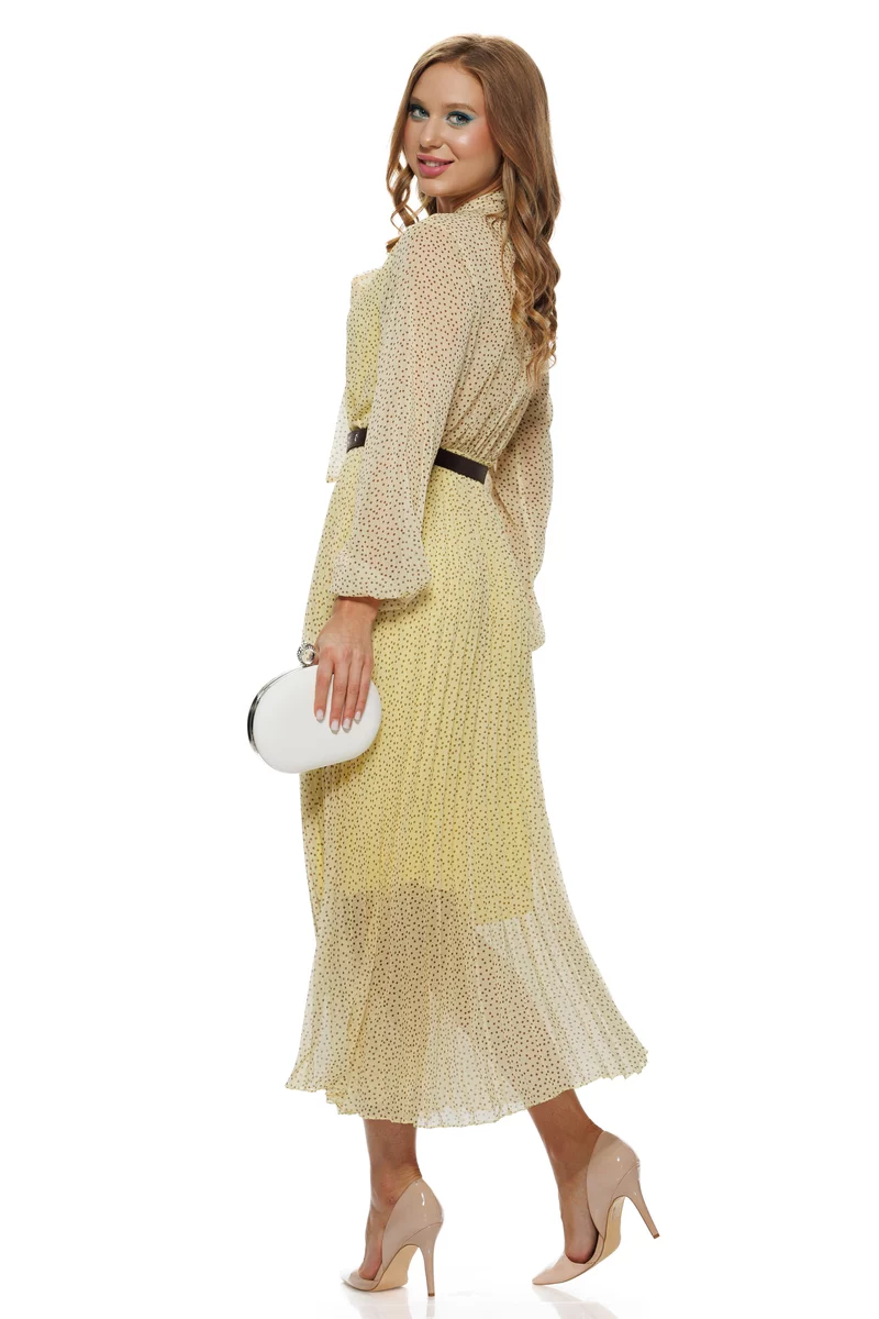 Rafinată, feminină și extrem de delicată, această rochie elegantă din voal mătăsos cu imprimeu cu buline este alegerea ideală pentru apariții romantice și sofisticate. Nuanța delicată de galben pai combinată cu textura vaporoasă a materialului creează un efect diafan, perfect pentru evenimente speciale, petreceri de zi sau ținute elegante casual.