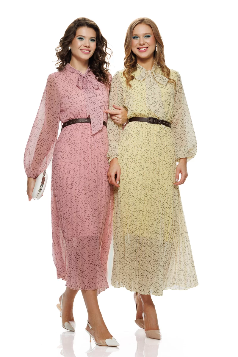 Rafinată, feminină și extrem de delicată, această rochie elegantă din voal mătăsos cu imprimeu cu buline este alegerea ideală pentru apariții romantice și sofisticate. Nuanța delicată de roz pastel combinată cu textura vaporoasă a materialului creează un efect diafan, perfect pentru evenimente speciale, petreceri de zi sau ținute elegante casual.