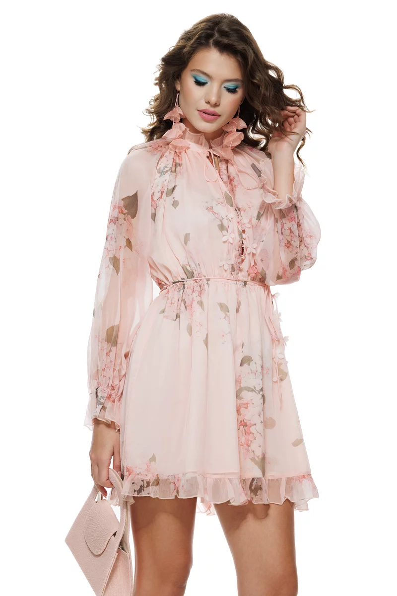Această rochie elegantă din voal mătăsos roz surprinde esența feminității delicate și a romantismului modern. Imprimeul floral fin, în nuanțe pastelate, se împletește armonios cu volănașele diafane, creând o siluetă ușoară, fluidă și extrem de rafinată. Este genul de rochie care îți oferă o prezență grațioasă, plină de sensibilitate și eleganță naturală, ideală pentru momentele în care vrei să te simți specială.
