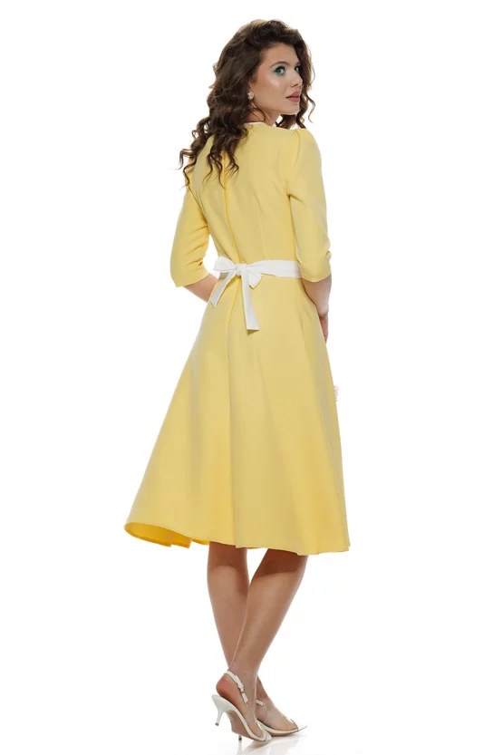 Rochie eleganta Fofy galbena clos cu insertii albe si aplicatii florale sidefate sofisticate
