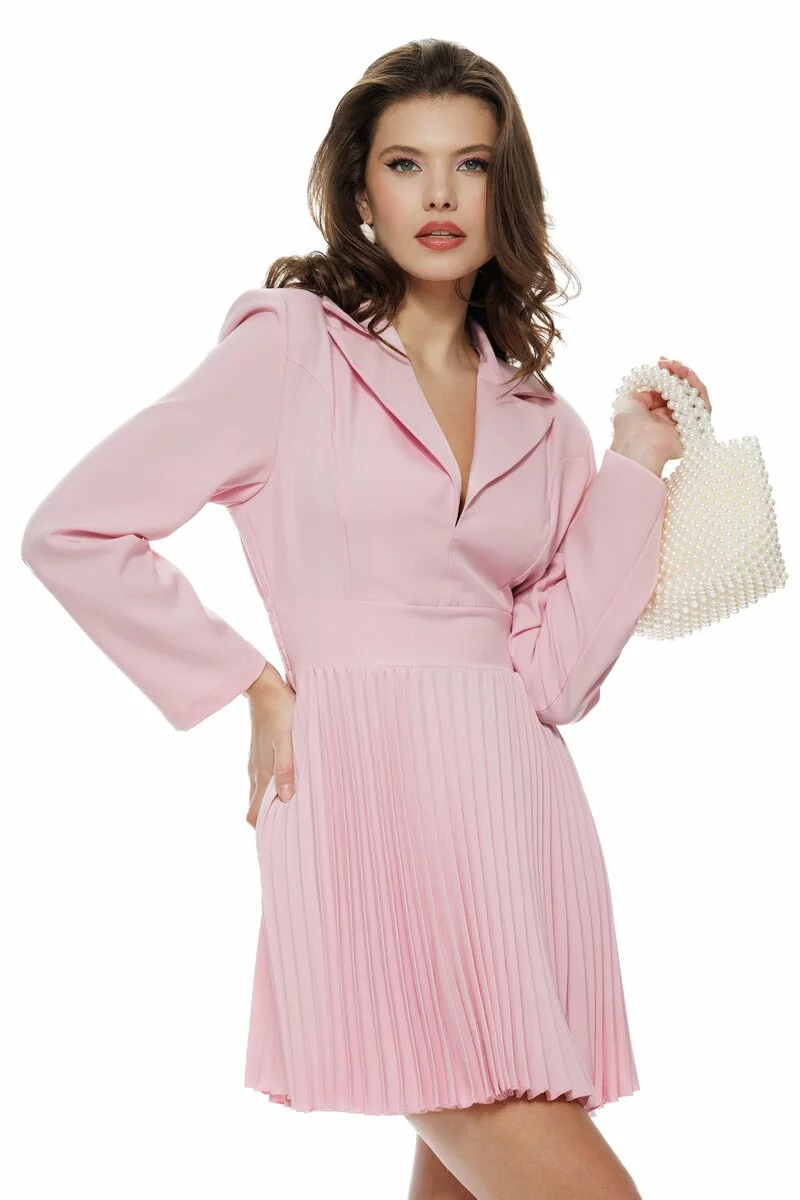 Rochie eleganta roz cu fusta plisata si revere