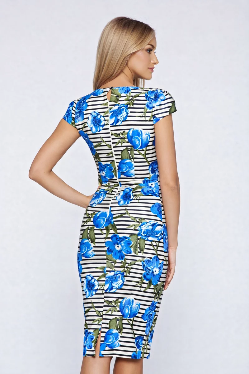 O rochie care atrage priviri prin contrastul ei chic: dungi clasice alb-negru și flori albastre intense, într-o combinație fresh și sofisticată. Croiul tip petrecut cu decolteu în V pune în valoare bustul, iar cordonul din talie conturează frumos silueta, oferind un efect feminin și elegant. Perfectă pentru zilele în care vrei să arăți impecabil la birou, dar și pentru evenimente de zi sau ieșiri în oraș.