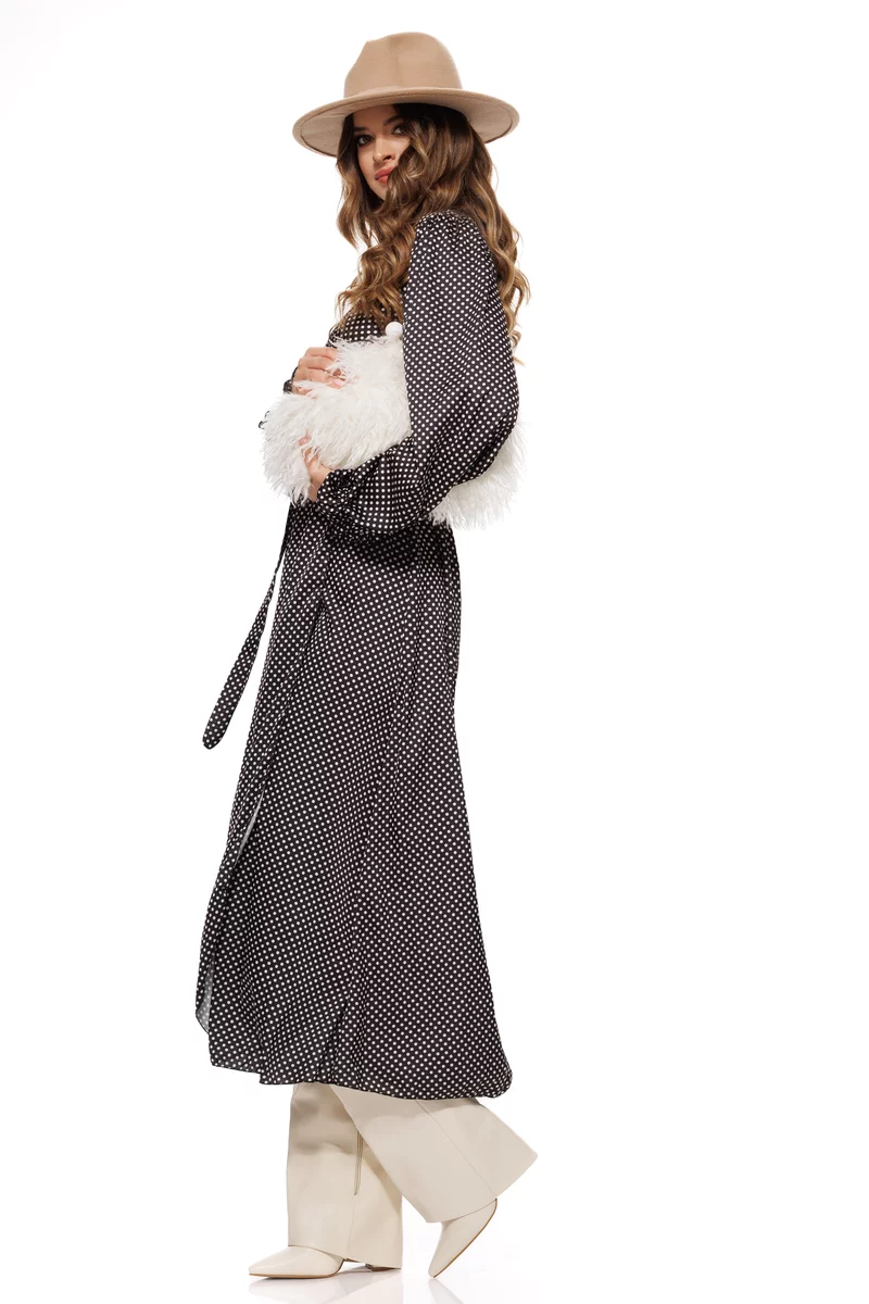 Această rochie midi neagra cu buline este o piesă clasică și feminină, care aduce un aer retro-chic perfect adaptat stilului modern. Croiala petrecută avantajează orice siluetă, subțiind talia și conferind un efect elegant și lejer.