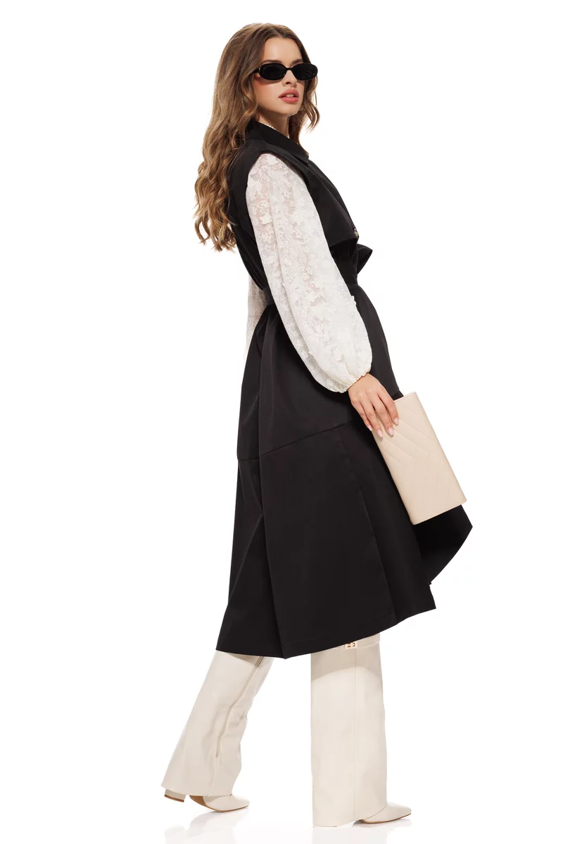 Această rochie tip trench neagra este o piesă statement ce aduce un aer fresh și sofisticat garderobei tale. Designul sleeveless (fără mâneci) îi oferă un plus de versatilitate, iar croiul asimetric, accesorizat cu cordon în talie, subliniază silueta și adaugă rafinament.