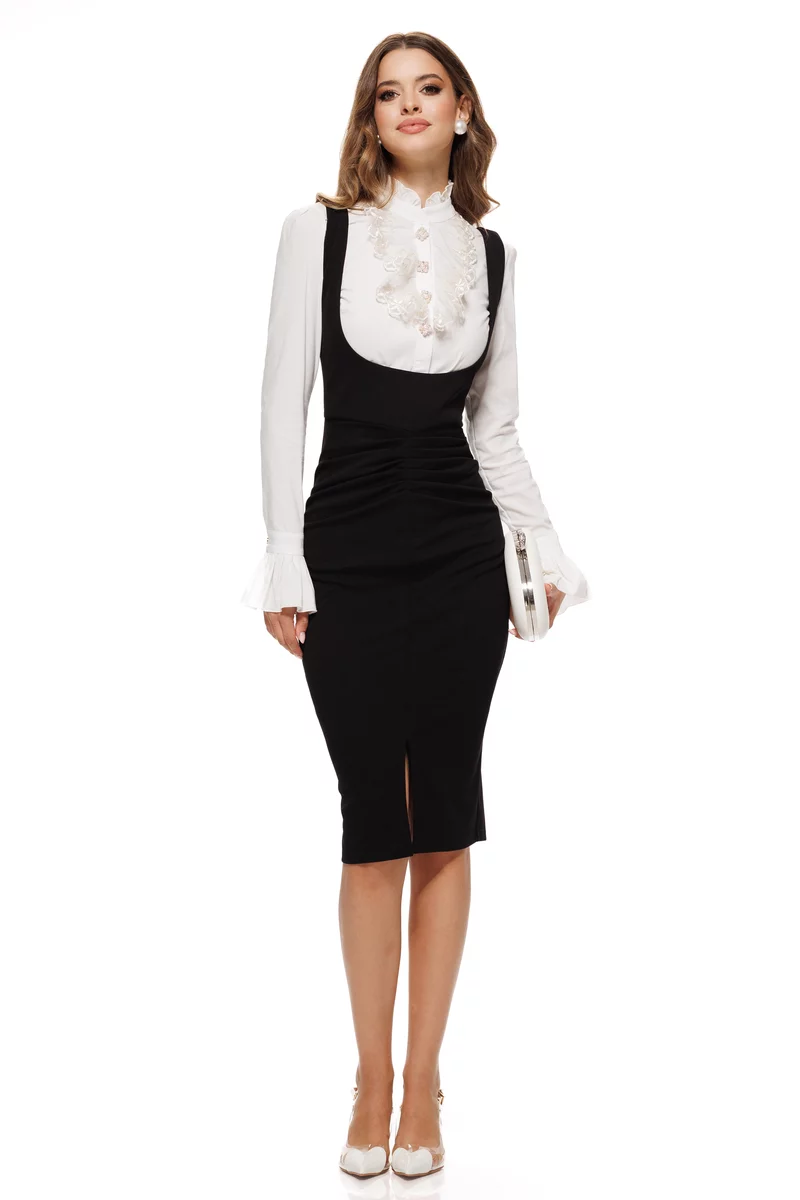 Recomandări de styling: Poartă sarafanul cu o cămașă albă cu volane și pantofi stiletto pentru un look elegant sau cu o bluză simplă și balerini pentru o ținută mai relaxată, dar chic.