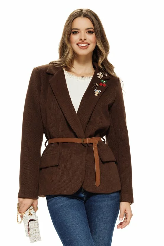 Alege acest sacou elegant mocca mouse cu broșe și curea camel și oferă ținutelor tale un plus de stil, rafinament și feminitate autentică!