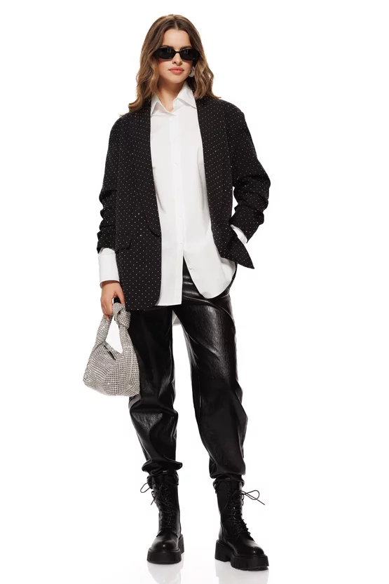 Sacoul negru cu buline strasuri fine este o piesă statement care adaugă un aer sofisticat și jucăuș în același timp. Ideal pentru birou, evenimente sau ținute casual-elegante, îți oferă versatilitatea de care ai nevoie pentru a impresiona.