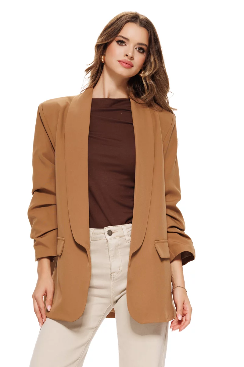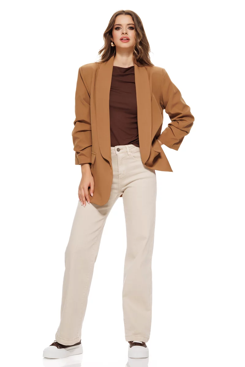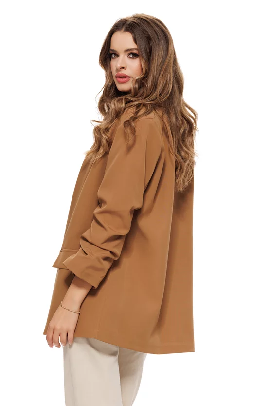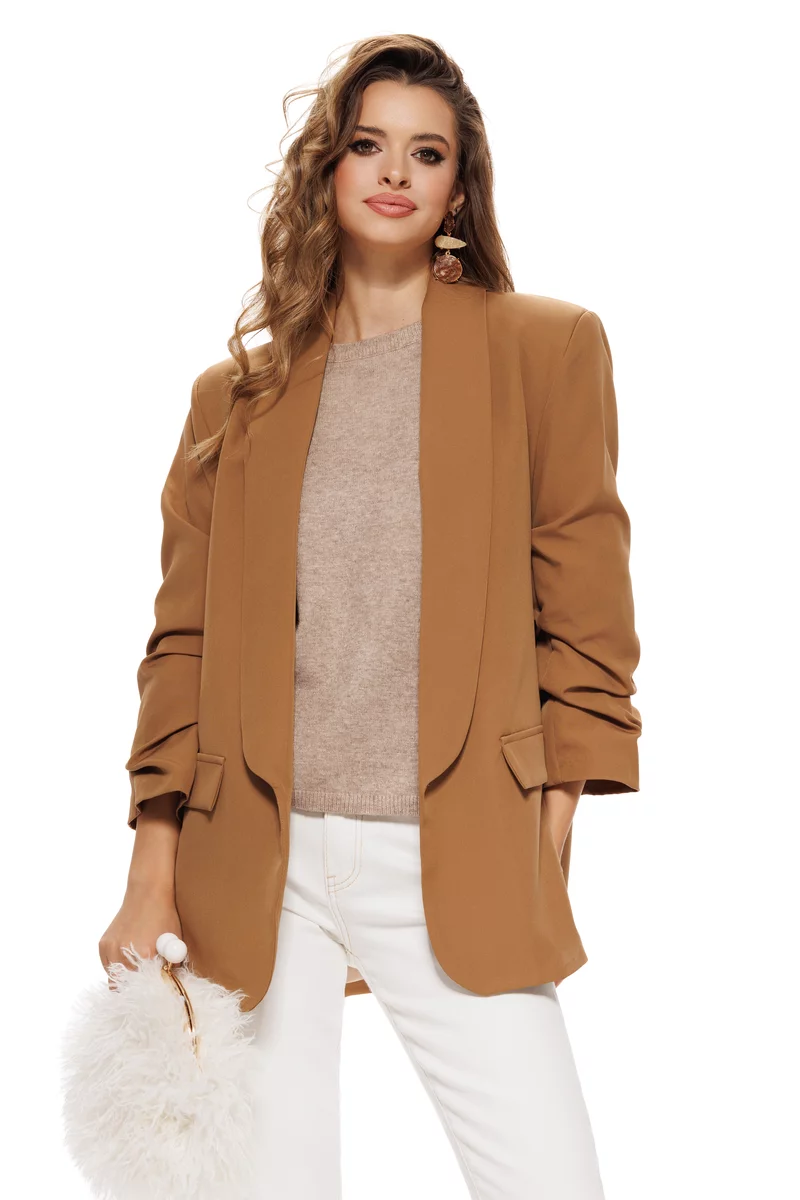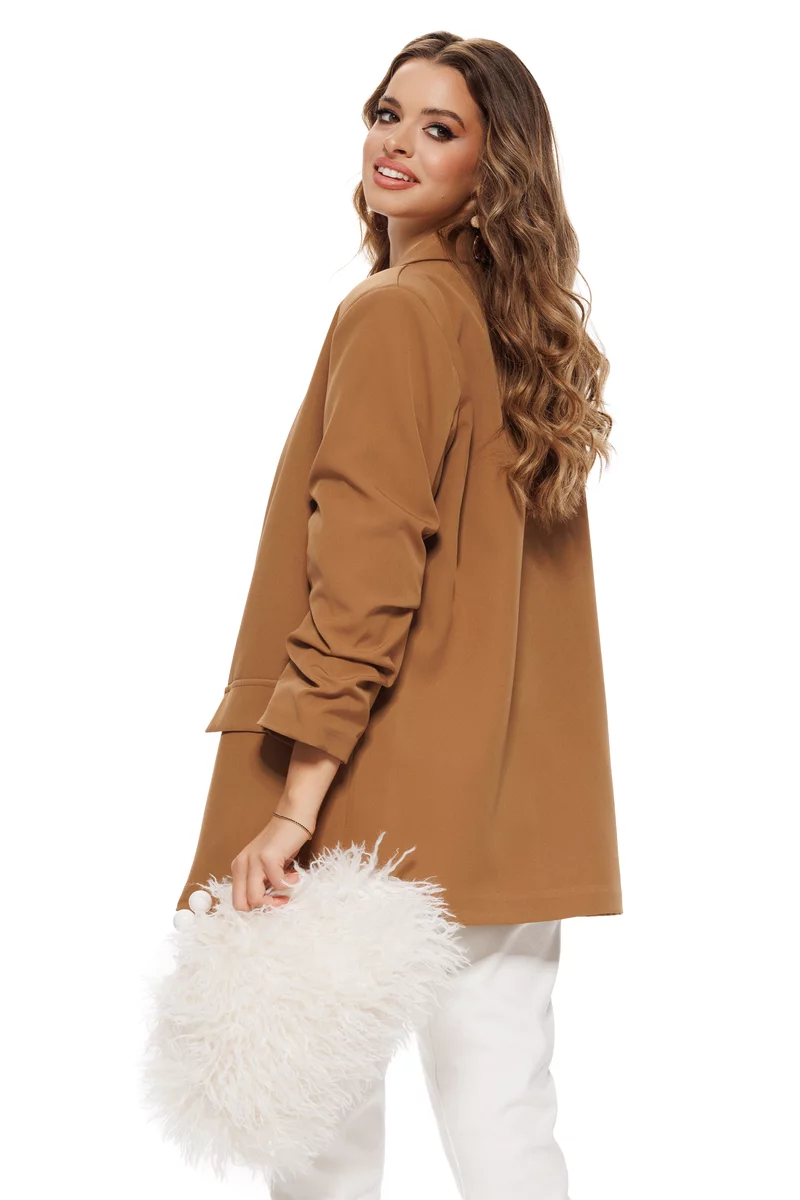Sacou de dama elegant, croit lejer din material premium in tonuri autumnale de camel. Un model actual cu linie evergreen care se adapteaza perfect unui lifestyle activ, modern. Usor de combinat atat in tinute office cat si in unele relaxate, aceasta piesa este una cu adevarat necesara pentru garderoba noului sezon. Designul in tendinte, manecile usor fronsate la baza, reverele stilizate cu linie masculina si refiletii decorativi- sunt atuurile stylish ale acestei piese timeless. Accesorizeaza cu elemente in trend, in echilibru cromatic cu outfitul compus. Alege palarii din fetru in tonuri similare, cizme inalte cu toc stiletto si genti cu finisaje clasice.