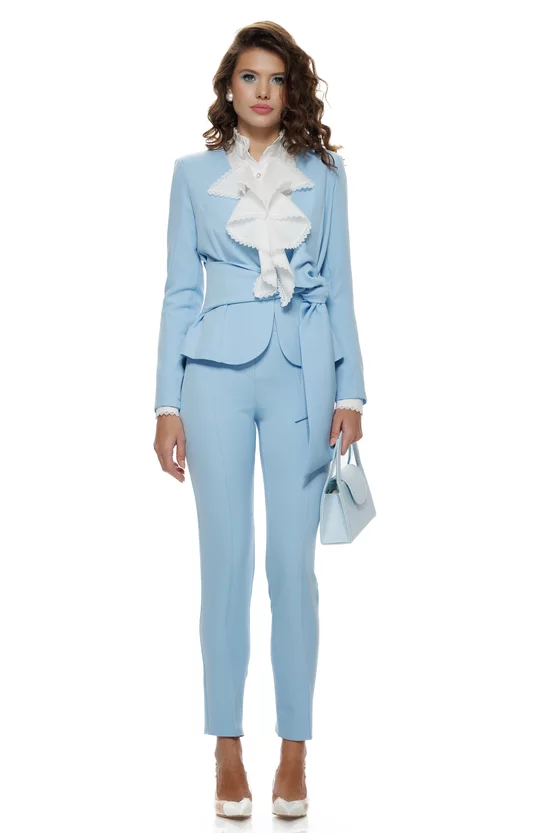 Sacou dama Fofy bleu cu croiala cambrata cu cordon in talie si fara revere